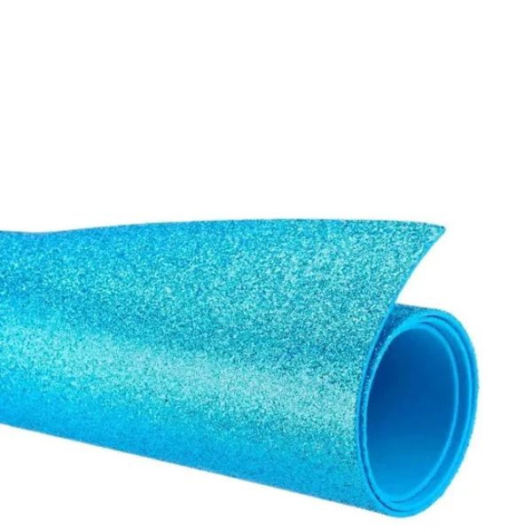 Cartolina EVA azul claro glitter 40x48cm, pacote 5 folhas, resistente e brilhante para artesanato e decoração.