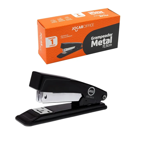 Grampeador metal 11,5cm, resistente e prático para uso em escritório e casa.