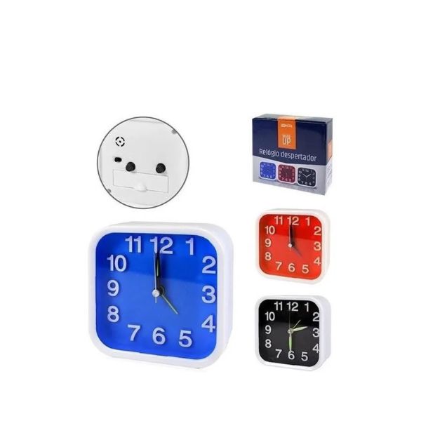 Relógio despertador plástico, compacto e funcional para facilitar a rotina com alarme prático.