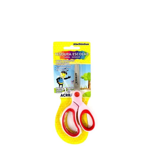 Tesoura escolar com cabo de abelhinhas, segura e prática, ideal para uso infantil em escola e artes.